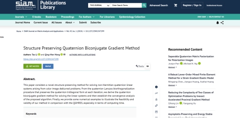 近日,jdb电子中国官方网站李涛博士以第一作者署名的文章“Structure Preserving Biconjugate Gradient Method”在国际数值代数领域权威期刊《SIAM Journal on Matrix Analysis and Applications》正式发表,文章链接https://doi.org/10.1137/23M1547299。