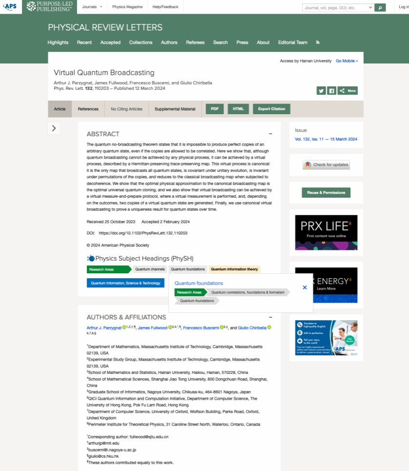 近日,jdb电子中国官方网站教师James Fullwood以通讯作者及共同第一作者在权威期刊《PHYSICAL REVIEW LETTERS》合作发表了题为“Virtual Quantum Broadcasting”的学术论文。合作者为麻省理工学院Arthur J. Parzygnat教授、名古屋大学Francesco Buscemi教授和香港大学Giulio Chiribella教授。