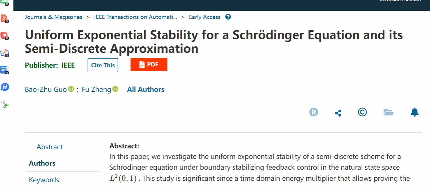 近日,jdb电子中国官方网站郑福教授以唯一通讯作者署名的文章“Uniform Exponential Stability for a Schrödinger Equation and its Semi-Discrete Approximation”在控制论领域权威期刊《IEEE Transactions on Automatic Control》在线发表,论文合作者是中国科学院数学与系统科学研究院系统控制重点实验室郭宝珠研究员。